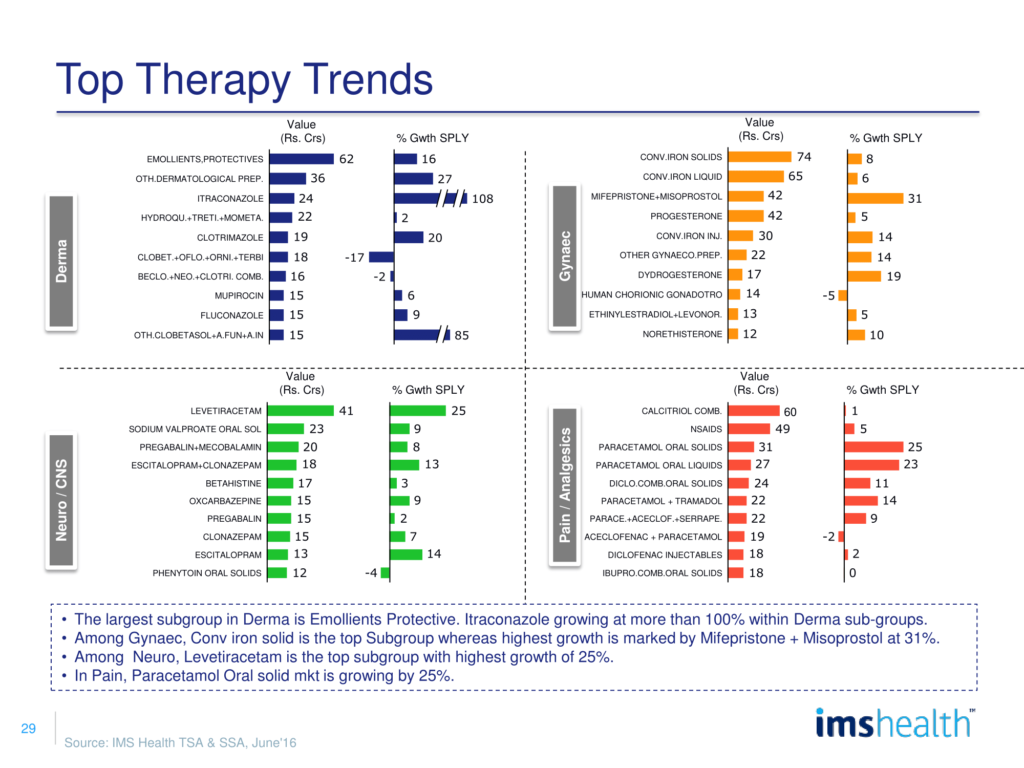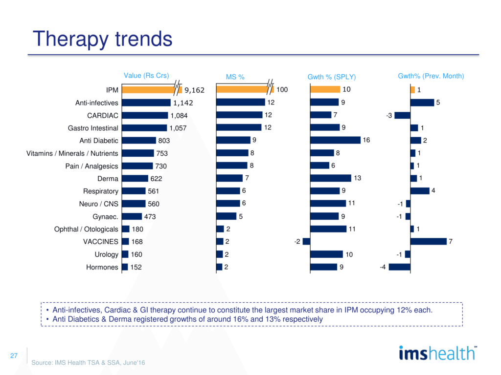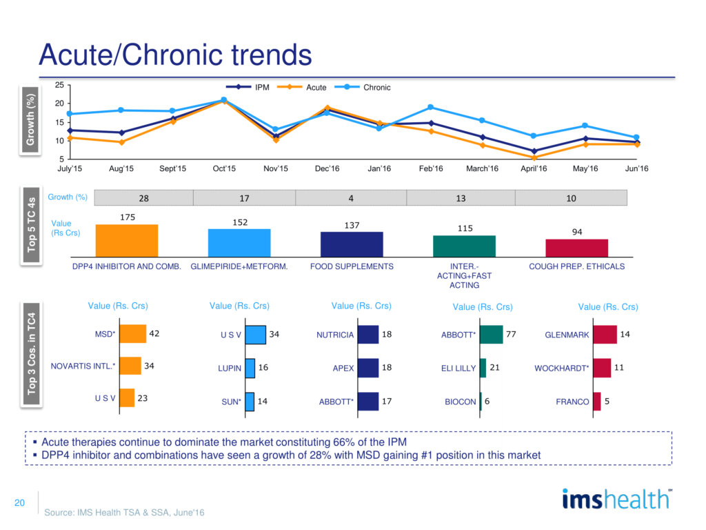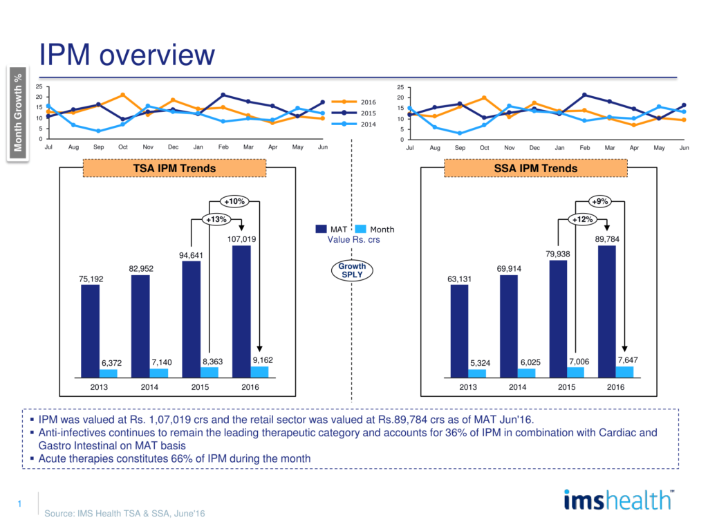 Acute therapies remain the pillar of IPM with a 66% contribution to the total market for the month. Chronic therapy areas have outpaced acute therapies consistently in terms of growth at 10.7% for the month vis-Ã -vis a 9% growth for acute therapy areas.