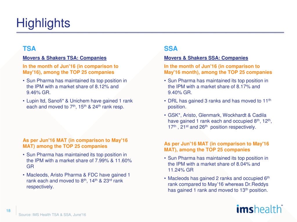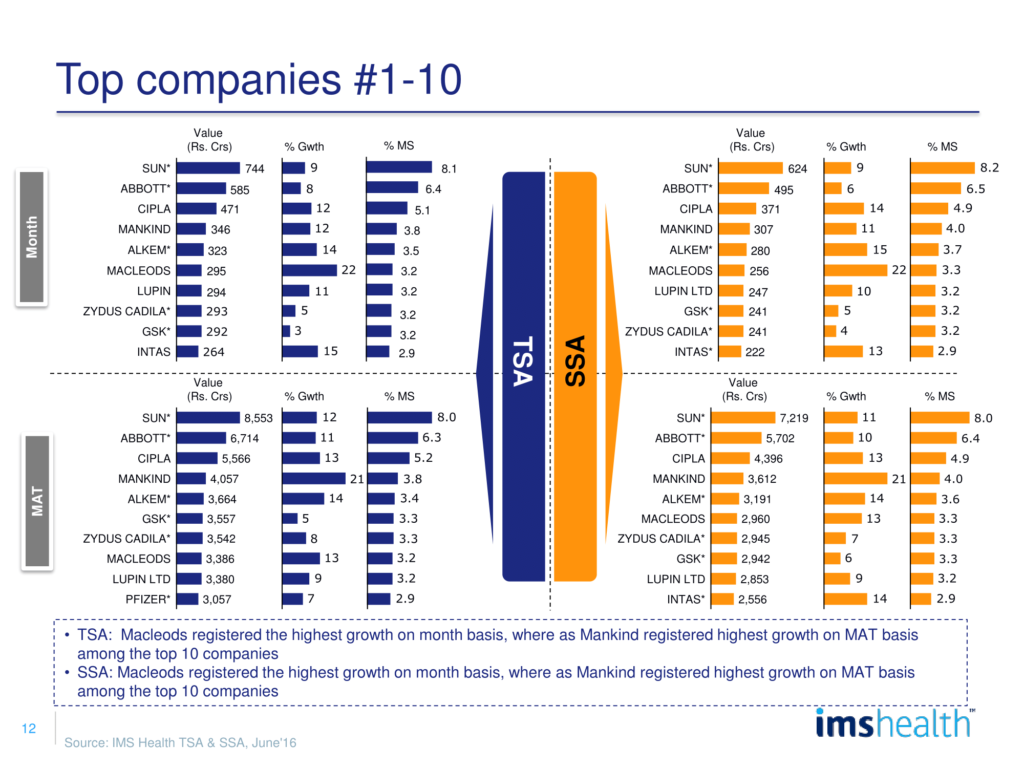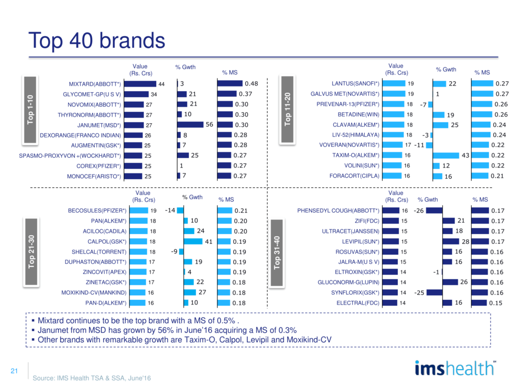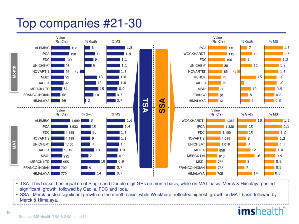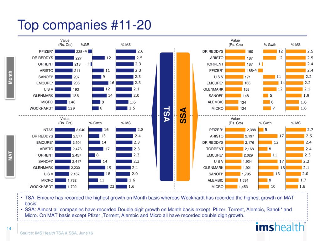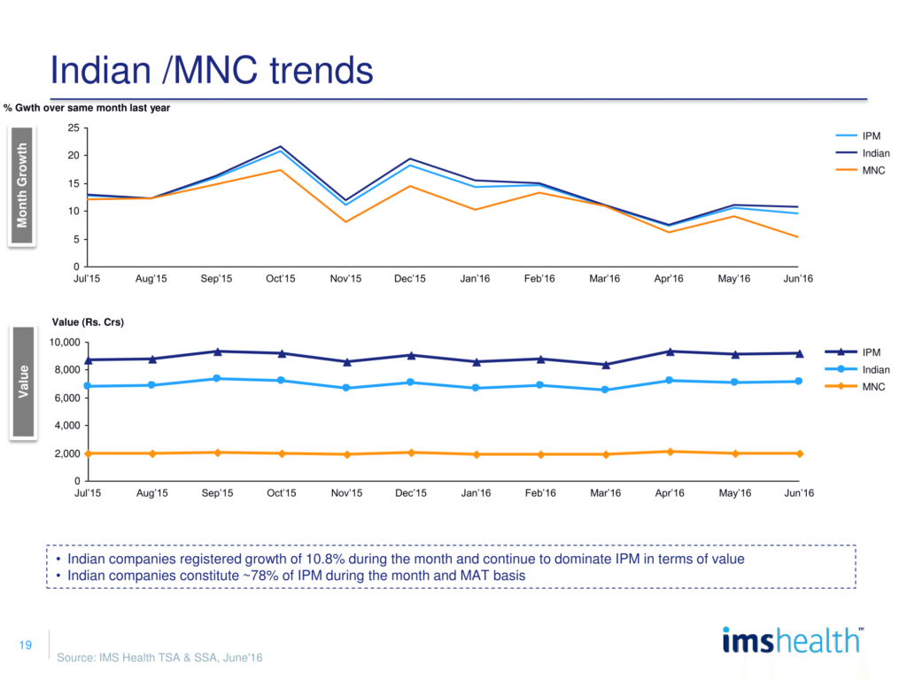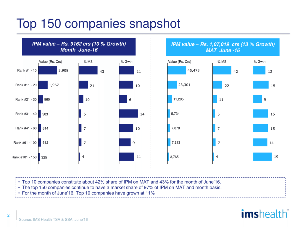 IPM has witnessed some big ticket M&As over the past few years. Despite this consolidation, the industry remains fragmented with top 10 players contributing 43% of overall sales and reflecting a robust 11% growth for the month of June 2016. Â Companies ranked 11-20 contributed 21% of total revenues for the month reflecting a growth of 10% aided by strong growth posted by Wockhardt (23%), Glenmark (19%), USV (18%), Aristo (17%) and Intas (16%).