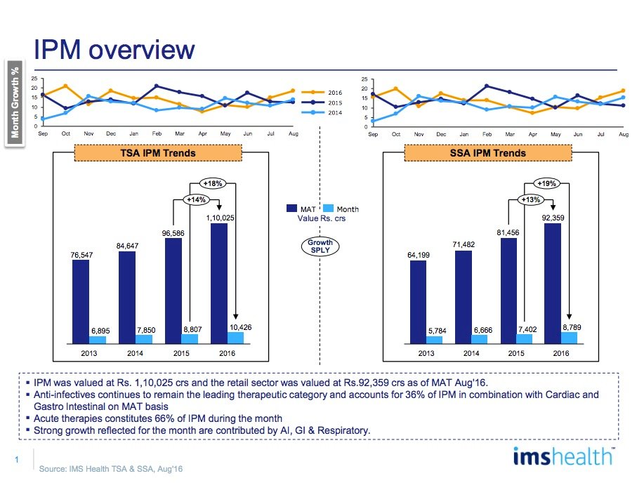 TThe Indian Pharmaceutical Market (IPM) was valued at Rs. 10,426 crores in the month of August 2016 clocking a strong 18% growth over same period last year (SPLY). This was the second consecutive month where the IPM crossed the 10,000 crore mark. On a MAT August 2016 basis, the industry was valued at Rs. 110,025 crores and reflected a 14% growth with volumes contributing around 35% of this growth.The Indian Pharmaceutical Market (IPM) was valued at Rs. 10,426 crores in the month of August 2016 clocking a strong 18% growth over same period last year (SPLY). This was the second consecutive month where the IPM crossed the 10,000 crore mark.