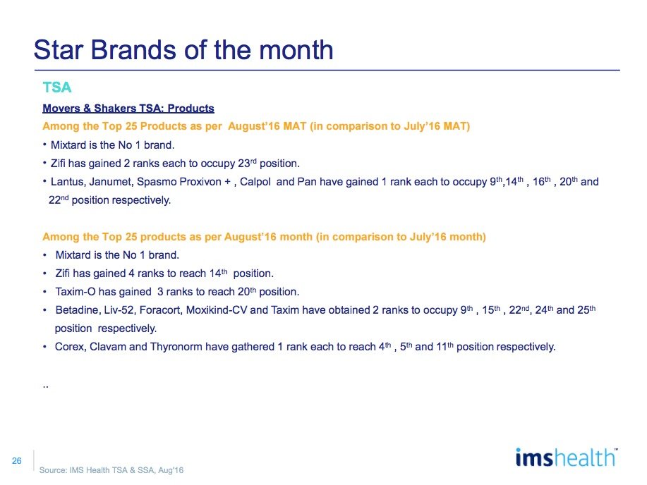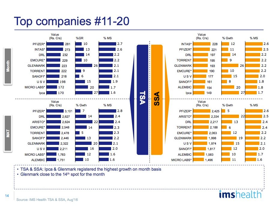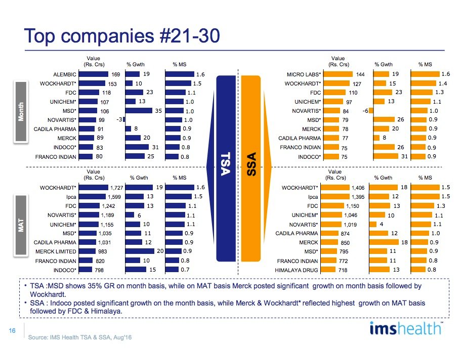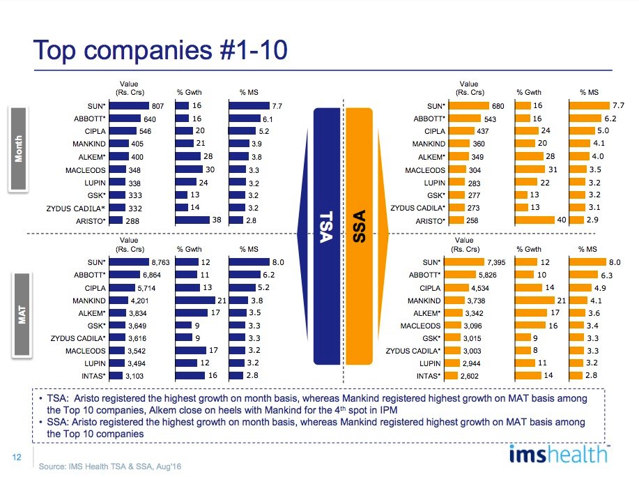 Among top 25 companies, Aristo gained 2 ranks and moved to 10th rank for the month while Macleods, Lupin, Glenmark & Ipca gained 1 rank each and moved to 6th, 7th, 15th and 20th rank respectively vis-Ã -vis July 2016.