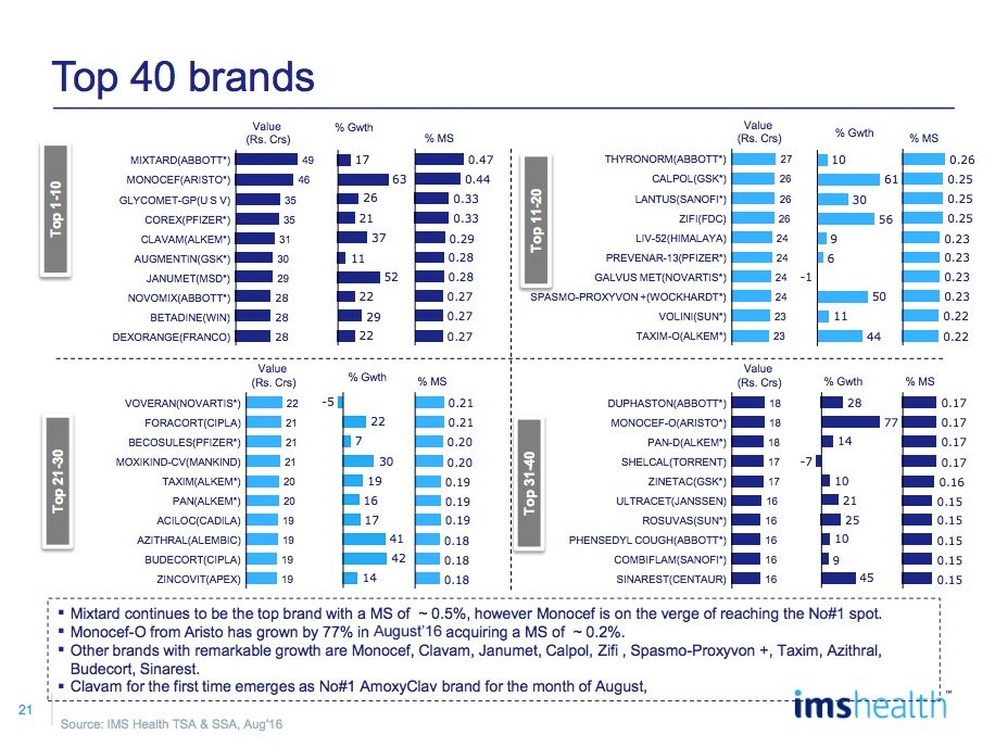 Among the top 10 companies, Cipla (20%), Mankind (21%), Alkem (28%), Macleods (30%), Lupin (24%) and Aristo (38%) grew faster than IPM for the month while in the 11-20 companies, Glenmark (26%), Micro labs (20%) and IPCA (27%) outpaced the market.