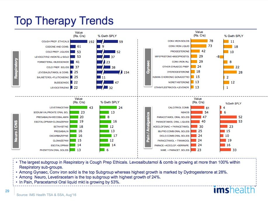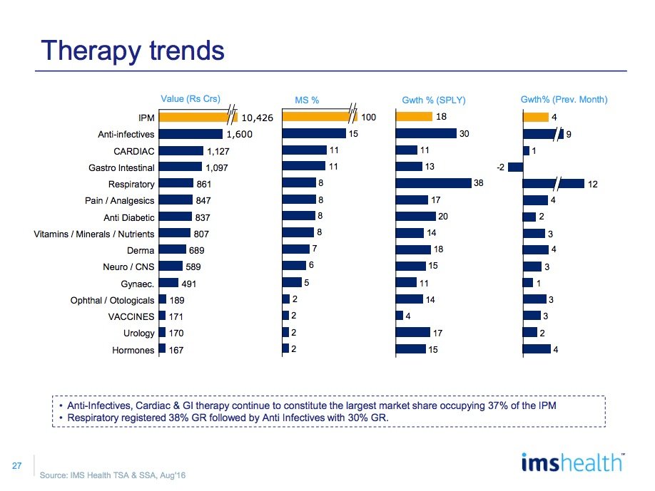 Anti-infectives was by far the largest therapy area for the month with a revenue of Rs. 1600 crores reflecting a 30% growth on the back of a good monsoon witnessed across the country.
