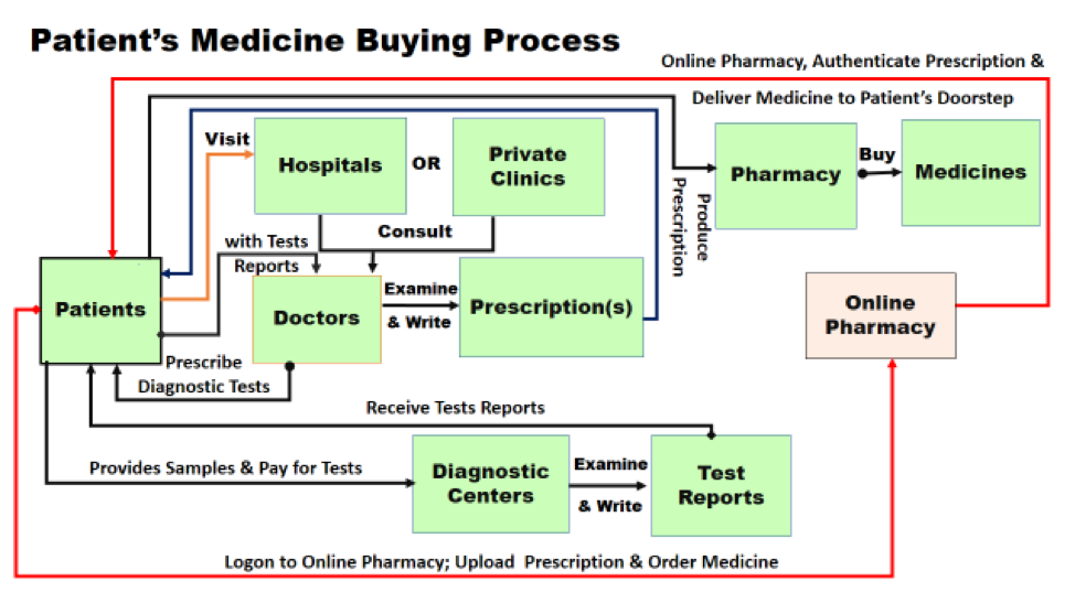 In the above diagram, the system is fragmented and not connected. Patients often have to visit multiple retail pharmacies to purchase the complete prescription and waiting time at diagnostic centers and clinics is high causing several difficulties and inefficiencies. e-Pharmacies are an integrated system where pharmacies, patients and physicians are connected. In this connected system patients are benefitted in terms of time, cost, delivery and ease of use. There are uses as well as abuses in the digitally integrated system. Delivery of medicines without prescriptions could lead to self-medication and abuse of narcotic drugs.