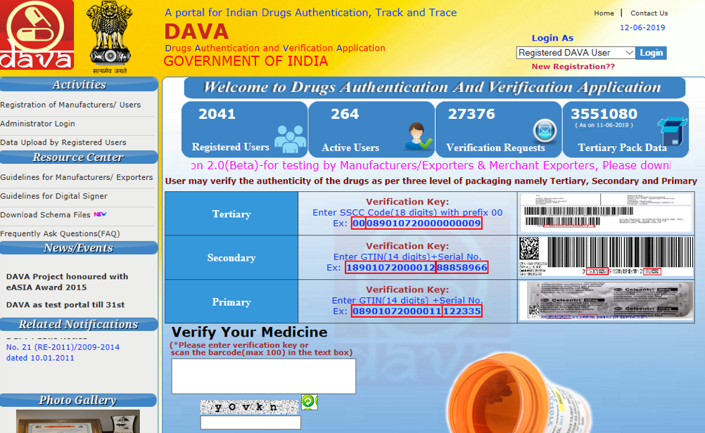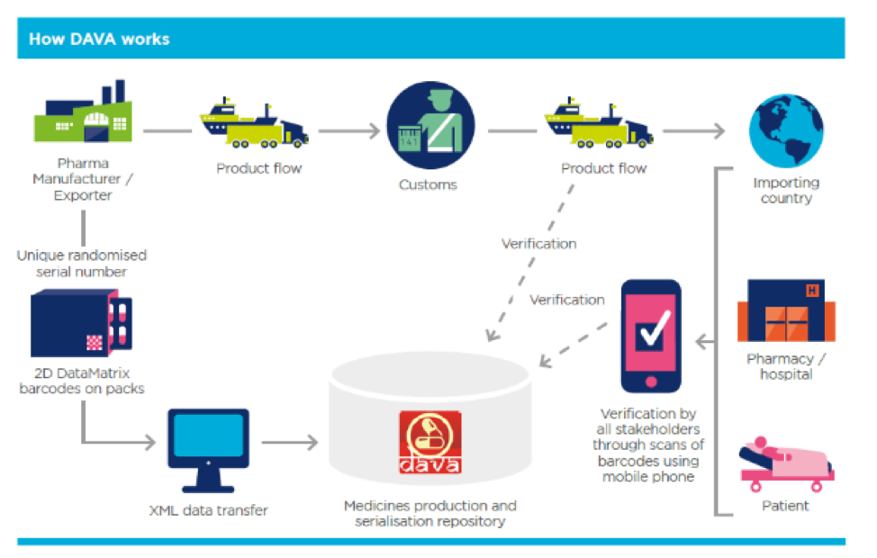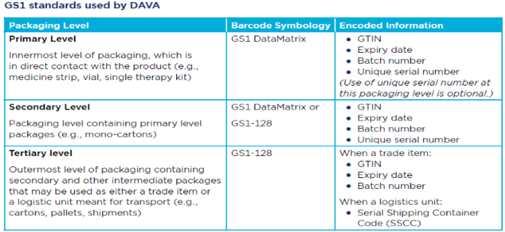 DAVA relies on the use of Global Trade Item Numbers (GTINs) plus serial numbers by manufacturers to easily identify the various packaging hierarchy levels of pharmaceuticals such as primary, secondary and tertiary (when a trade item) levels. DAVA has a mobile app version as well (1000+installs as on date) . Download the DAVA mobile app for Android.
