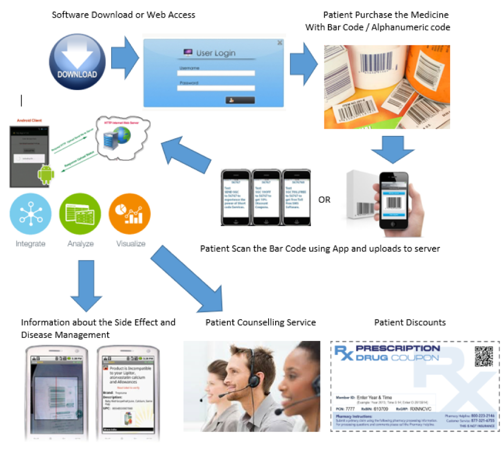 - Once the patient scans the barcode through his smart application, the information is captured against his account in the cloud database server or alternatively, if the patients logs on to the website or SMS’s the alphanumeric code from his phone, the same is captured against his account in the cloud base server.