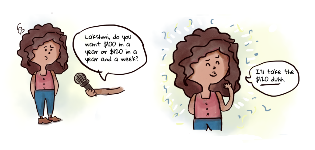People ascribe less value to delayed rewards, such as avoiding cancer or heart disease, relative to more immediate, smaller rewards, such as having a cigarette or an extra dessert now. In simple terms given a choice we opt for instant gratification. The ability to delay gratification has been associated with many long term positive outcomes. Making patients aware about the principle of gratification and coaching them in developing positive short terms habits may help them in long term. It is more productive than only speaking about long-term benefits which are abstract and often difficult to connect.