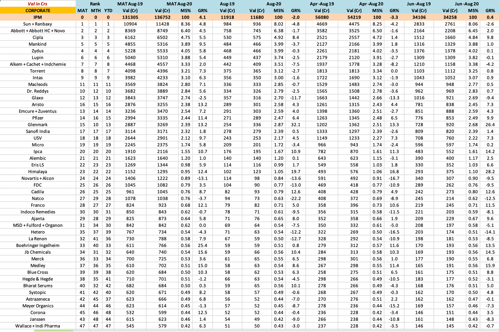 The COVID crisis has impacted IPM negatively – the growth seen in July 2020 was a mere 0.2%. This is down to -2.2% de-growth in August 2020 and shows a single digit growth of 4.1% on a MAT basis.