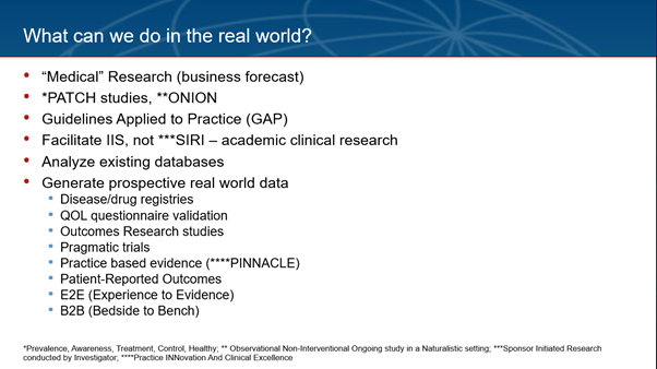 Since medical affairs is considered the data custodians they need to know how to identify unmet medical needs of the relevant market, and plug the gaps in local medical literature by facilitating the generation of primary data by the doctors. In addition to market research, the medical department can contribute by doing what is called as medical research, collecting epidemiology data (incidence, prevalence), which can sharpen the business forecasts/estimates. Guidelines released by medical societies can be updated regularly with scientific and financial help from the pharmaceutical industry. Practice-based real world evidence (vide infra) also has an important role to play to complement what is obtained from randomized controlled clinical trial data. Medical affairs can also do a lot with existing data, e.g., from electronic health records. They can partner with KOLs who are very good with systematic reviews (including meta-analyses). Publications that result from initiatives such as advisory board meetings or campaigns (such as Guidelines Applied to Practice or GAP programs that bridge the gap between what guidelines recommend and what doctors practice) can be followed by information dissemination programs that eventually drive improvement in outcomes.