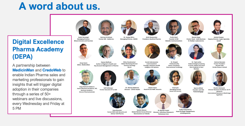 MedicinMan took up this responsibility in partnership with CredoWeb to create “Digital Excellence Pharma Academy” –DEPA and conducted 50+ online sessions with renowned Indian and International healthcare industry influencers as faculty members, from May 2020 to April 2021.