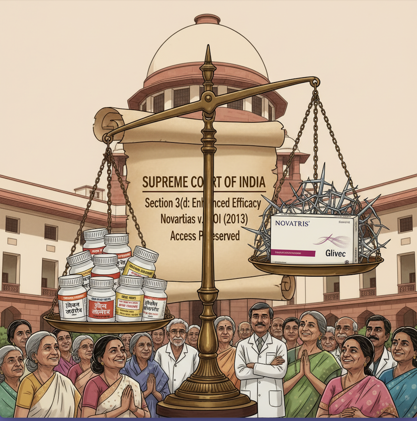 | Novartis Glivec Case | [Nature][2], [Wikipedia][1], [PharmaTimes][3], [Cancer.org][4], [The Legalschool][5], [Chemistry World][6], [The Lancet][7], [NIScPR][8] | Section 3(d) and “efficacy” requirements. Supreme Court upholds rejection. Affordable generics ensured. |