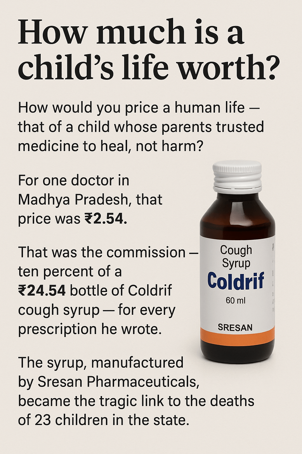 The Madhya Pradesh tragedy wasnโt only about a bottle of contaminated syrup. It was about a bottle of systemic rot โ capped by complacency, shaken by greed, and swallowed by public trust.