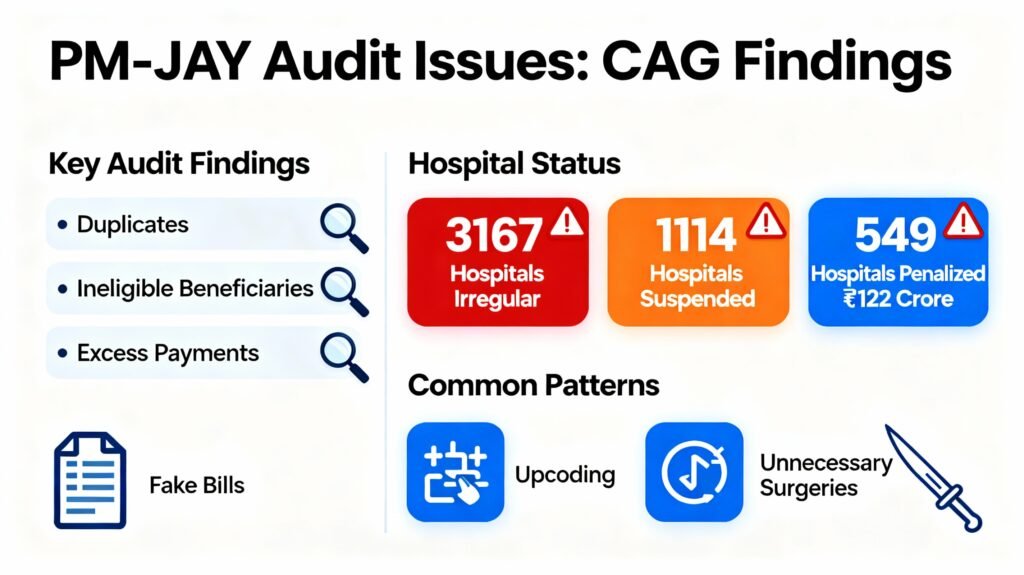 - A CAG performance audit of PM-JAY for 2018–2021 documented serious data and process anomalies: duplicate and ineligible beneficiaries, implausible demographic details, and excess payments to empanelled hospitals in multiple states.[7][8][2]