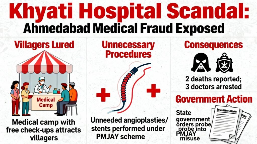 - In Ahmedabad’s Khyati Hospital case, investigators allege that rural health camps were used to “harvest” PM-JAY beneficiaries, exaggerate coronary blockages, perform unwarranted angioplasties—including on very young patients—and falsify consent and medical records to claim reimbursements; multiple deaths triggered criminal action.[11][12][13]