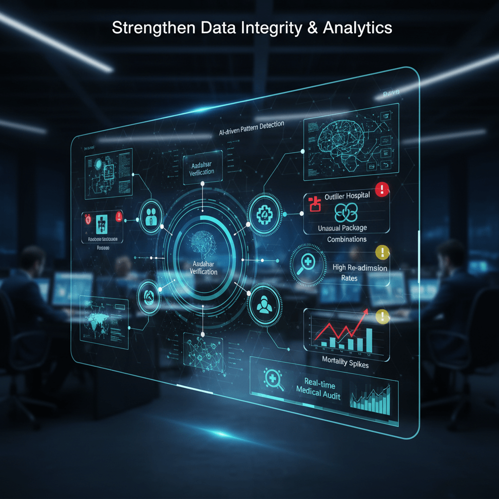 - Strengthen data integrity and analytics: fully integrate Aadhaar‑based verification, de‑duplicate beneficiaries, and deploy AI‑driven pattern detection to flag outlier hospitals, unusual package combinations, high re‑admission rates, and mortality spikes for real‑time medical audit.[9][2][7][1]
