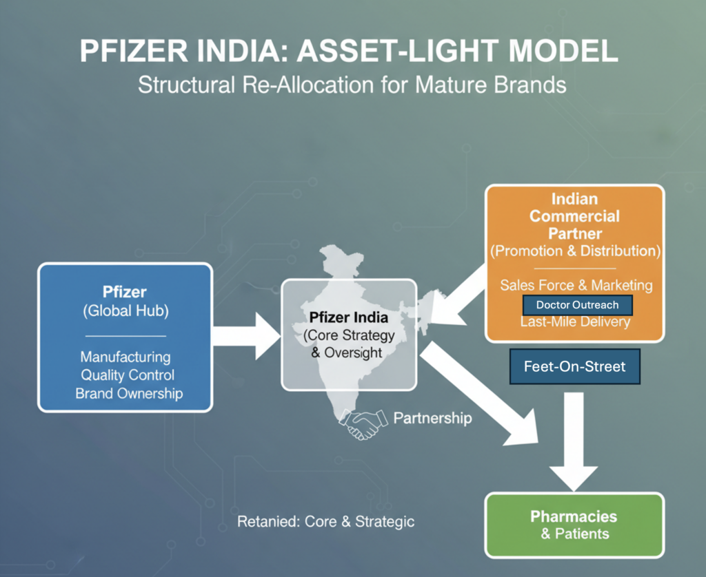 - Pfizer is shifting to an “India‑lite commercial, asset‑light” model for mature brands. It retains manufacturing, quality, and brand ownership, but outsources the expensive, people‑heavy promotion and last‑mile distribution to a partner better suited to Indian scale and complexity.