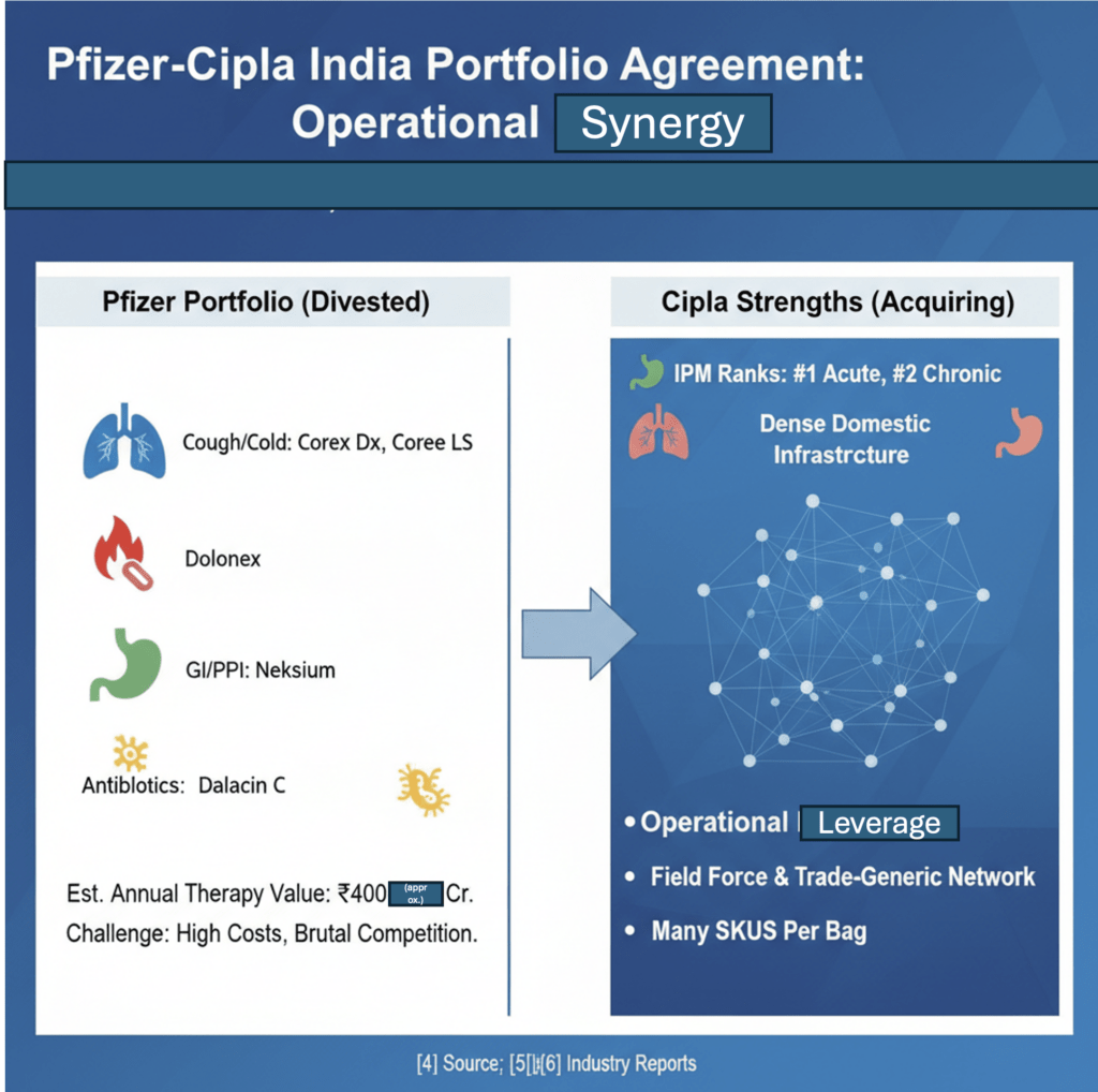 Estimates put the combined annual therapy value of these products at roughly ₹400–₹430 crore. For Pfizer, that pool is meaningful but not enough to justify maintaining a full‑fledged field force and distribution apparatus in a market where branded‑generic competition is brutal and promotional costs are rising. For Cipla, the same pool drops into an already amortised acute‑plus‑chronic footprint:[4]
