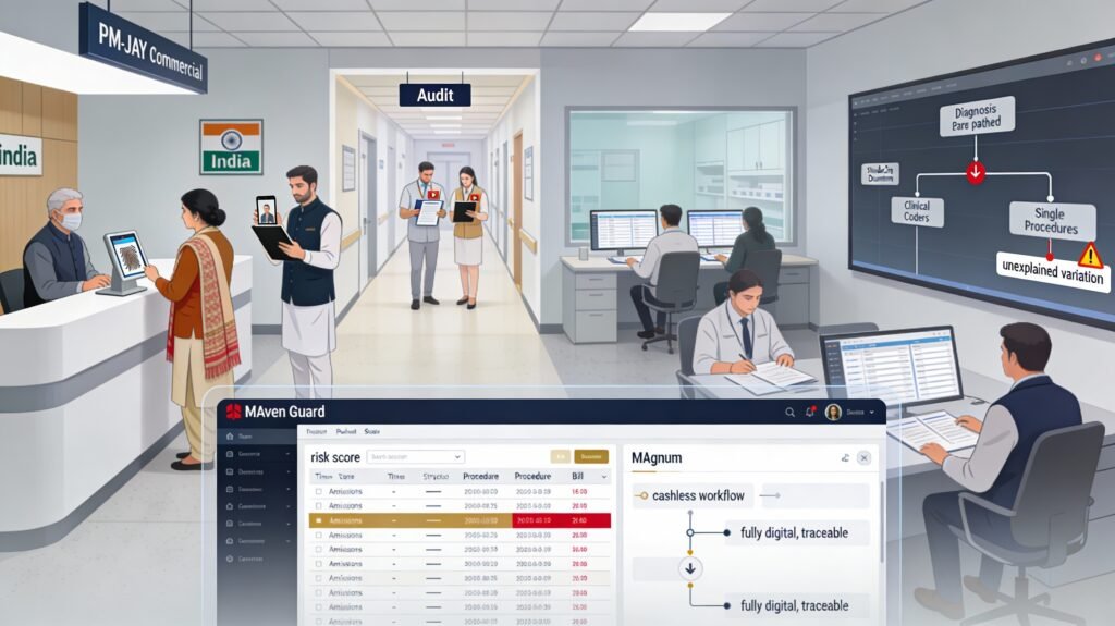 Private hospitals will operate under far stricter scrutiny, with AI engines like MAven Guard risk‑scoring every admission, procedure and bill line in real time. Government and payer‑side anti‑fraud frameworks already envisage routine on‑site audits, surprise inspections, biometric verification and mandatory photographic evidence for admissions and discharges—tools that will rapidly move from PM‑JAY into commercial insurance.[4][5][6][2][7]