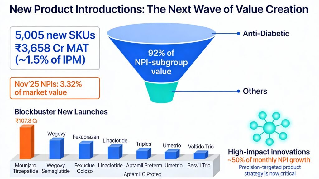 The past 12 months saw 5,005 new SKUs, contributing โน3,658 Cr MAT (~1.5% of IPM). In Novโ25 alone, NPIs represented 3.32% of market value.