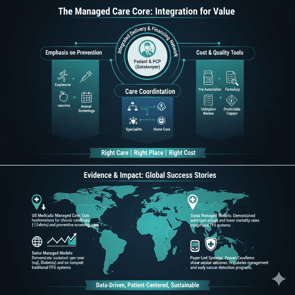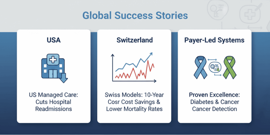 US Medicaid managed care cuts readmissions for chronic conditions like diabetes and boosts preventive screenings. Switzerland’s models sustain 10-year cost savings and lower mortality versus FFS. Payer-led systems excel in diabetes management and cancer detection. macpac+2