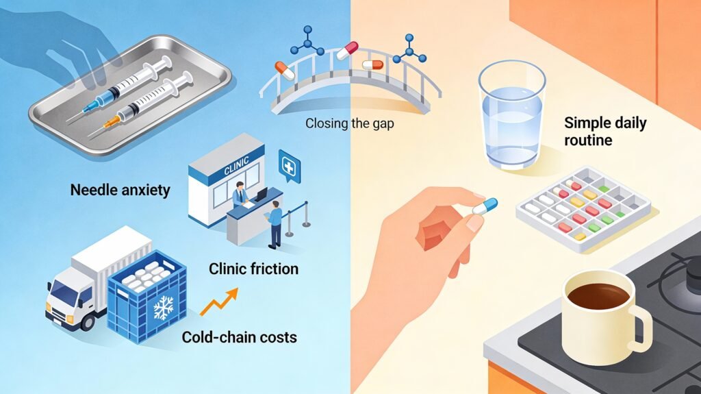 Oral meds fit into existing pharmacy, retail, and primary-care ecosystems.