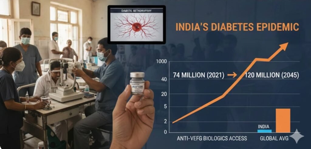 India is home to one of the world’s largest diabetes populations. The International Diabetes Federation (IDF Diabetes Atlas, 10th Edition, 2021) estimates that India has roughly 74 million adults living with diabetes, projected to exceed 120 million by 2045. Published Indian studies in the Indian Journal of Ophthalmology report diabetic retinopathy prevalence ranging from 16% to 28% among diabetics, depending on the cohort studied. This is not a marginal disease segment. It is a high-burden, expanding public health challenge. Yet access to premium anti-VEGF biologics has historically been constrained by price.