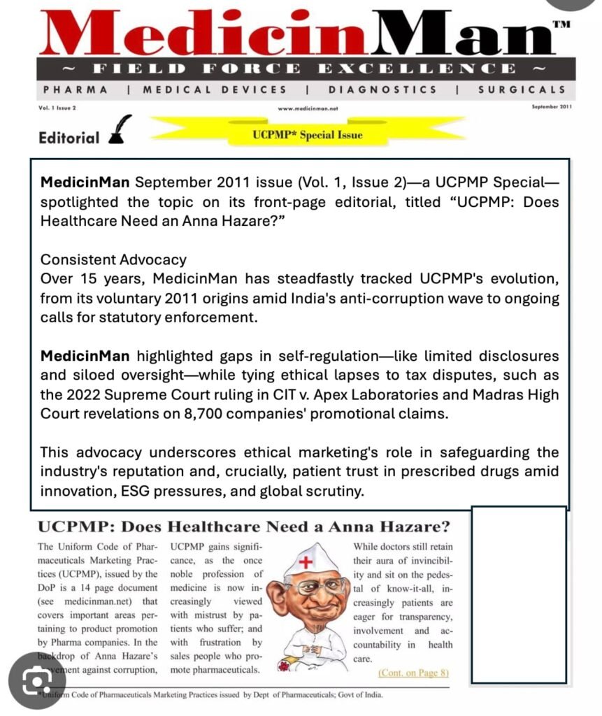 In September 2011, MedicinMan published a UCPMP Special Issue titled: “UCPMP: Does Healthcare Need a Anna Hazare?” At a time when India’s anti-corruption movement dominated national discourse, we asked whether a voluntary marketing code would be enough to reform pharmaceutical promotion practices.