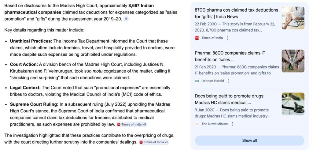 Disclosures before the Madras High Court indicated that approximately 8,700 pharmaceutical companies claimed deductions under “sales promotion” and “gifts” in FY 2019–20. Whether each claim was improper is a matter of scrutiny.