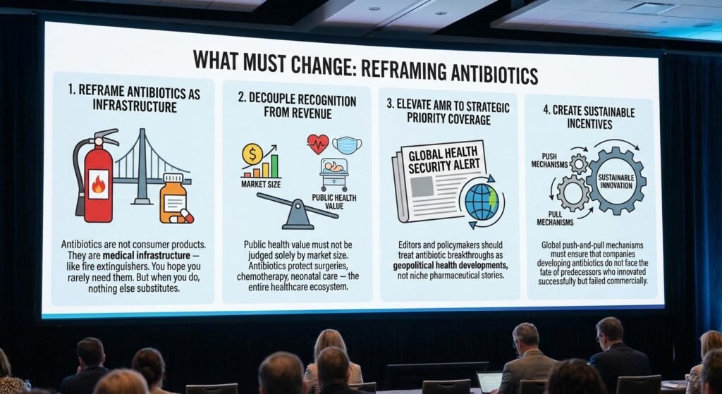 Public health value must not be judged solely by market size. Antibiotics protect surgeries, chemotherapy, neonatal care — the entire healthcare ecosystem.