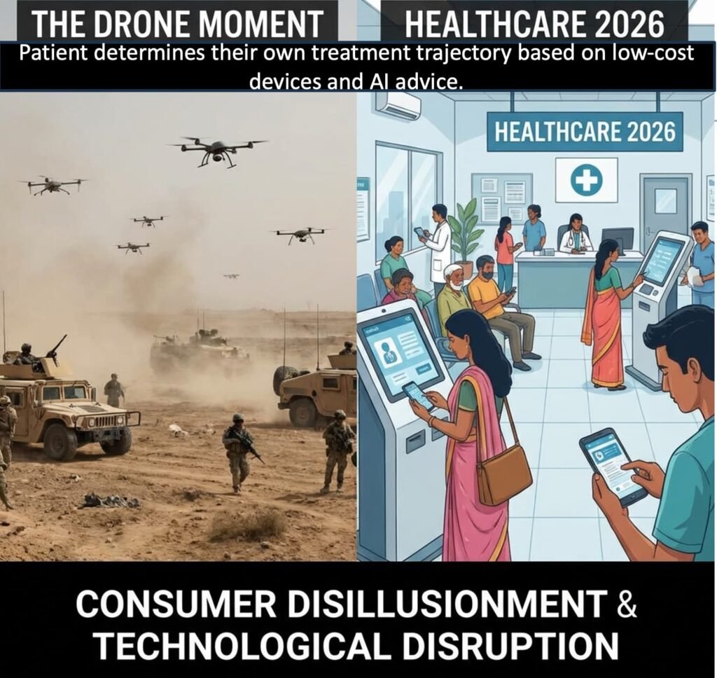If the drone moment revealed itself in asymmetric conflicts, India’s healthcare landscape offers a preview of global disruption. In India, patients never fully accepted the “rules” of centralized control, because the infrastructure to enforce them was incomplete.