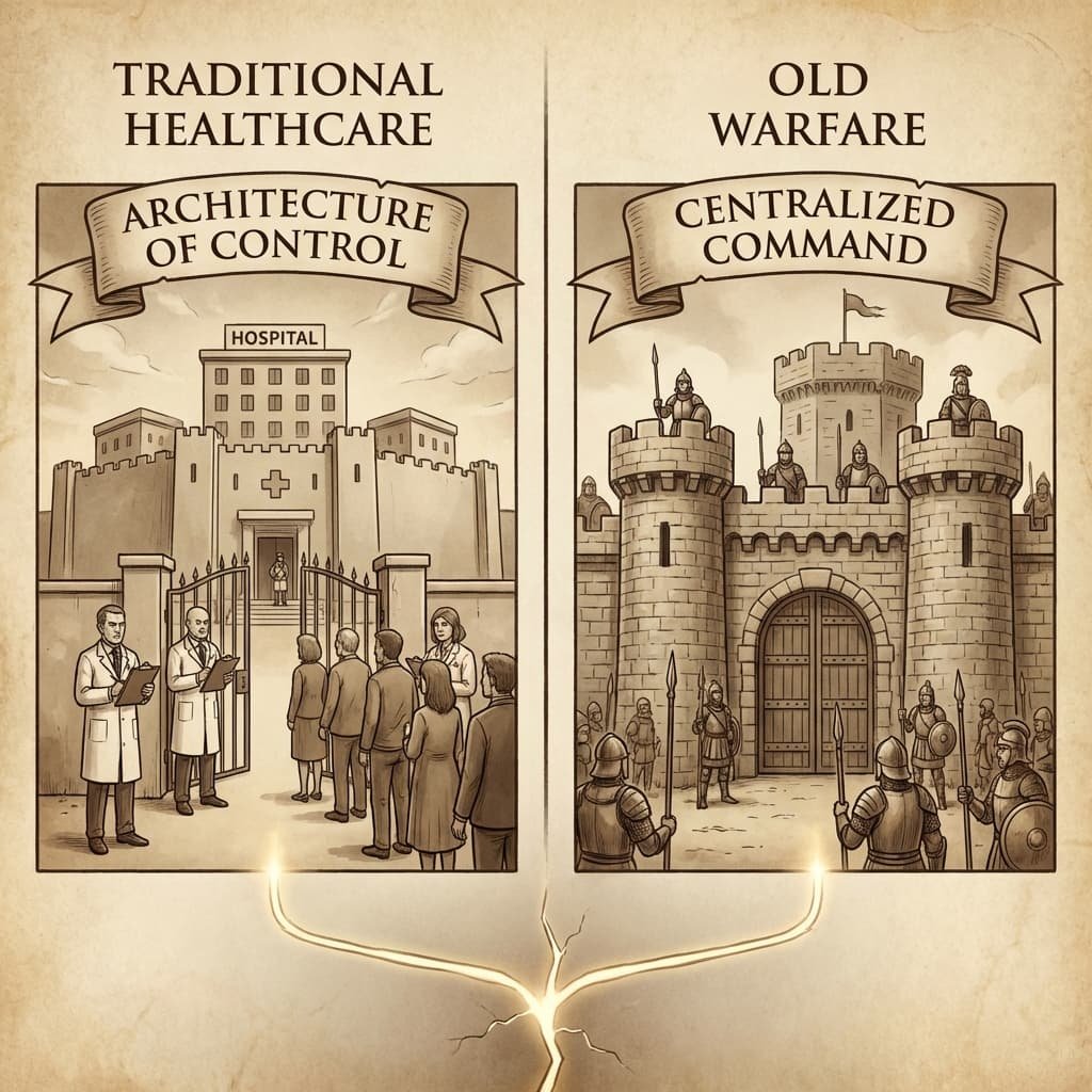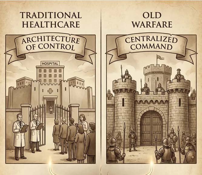 Traditional healthcare is built on an Architecture of Control. Like old warfare, it relies on centralized command (hospitals), professional gatekeepers (physicians), and a monopoly on authority (diagnosis and treatment).