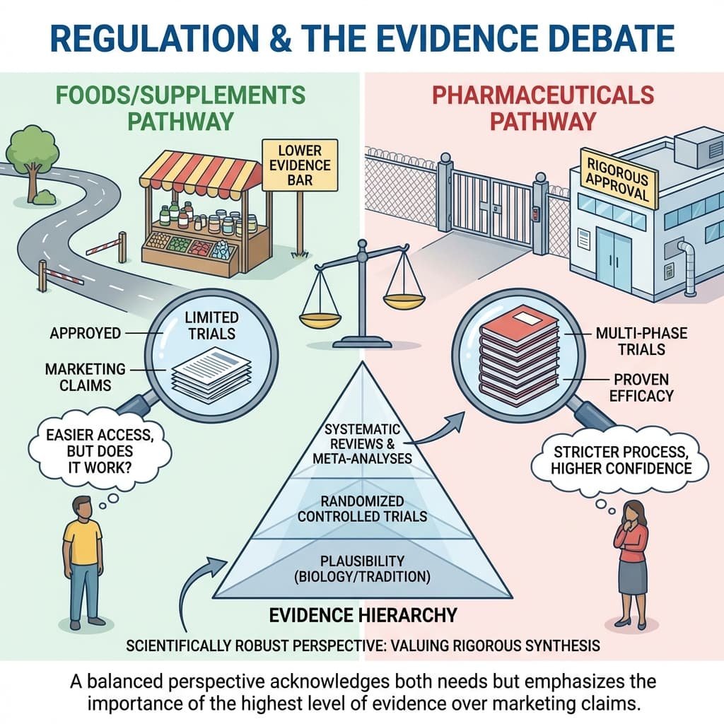 In many countries they are regulated as foods or dietary supplements rather than pharmaceuticals. As a result, the level of clinical evidence required for approval is often lower than for drugs. They do not need to prove efficacy through the same rigorous, multi-phase clinical trials required for new medications.