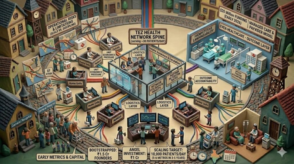 Tez Health is still very early. Public accounts describe the company as serving around 30 patients a day, bootstrapped with ₹1.5 crore from the founders and an additional ₹1 crore from angel investors, while aiming to scale to 10,000 patients a day across five to six metro cities over the next three to five years. Those are ambitious expansion targets, especially in a category where unit economics and quality assurance can weaken quickly when geographic coverage expands faster than operational discipline.[4][5][9][1]