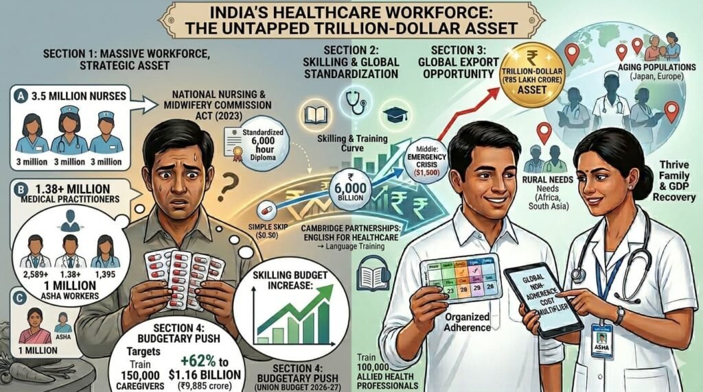 India currently possesses a massive workforce of 3.5 million nurses, over 1.38 million medical practitioners, and 1 million ASHA workers. Historically viewed as a domestic resource, this population is now a strategic export asset.