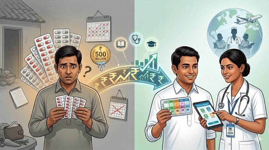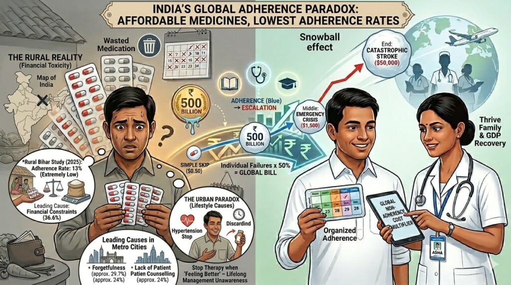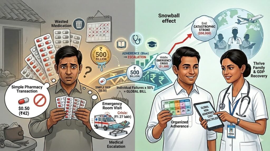 According to 2025โ2026 analyses from Frontiers in Pharmacology and OECD health working papers, the global economic burden of medication non-adherenceโthe failure to take prescriptions as directedโexceeds $500 billion (โน42.5 lakh crore) annually. This is the “Global Adherence Leak”: money wasted not on buying drugs, but on the catastrophic medical complications that occur when patients skip them.