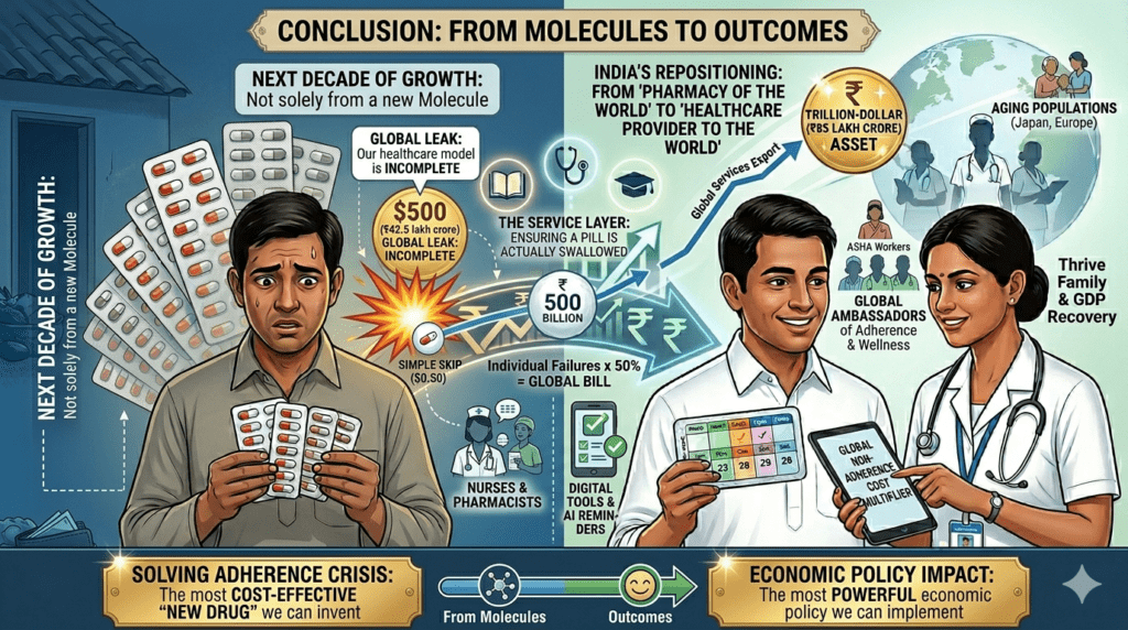 By repositioning its populationโfrom ASHA workers to AYUSH doctorsโas global ambassadors of “adherence and wellness,” India can move beyond being the “Pharmacy of the World” to becoming the “Healthcare Provider to the World.” Solving the adherence crisis is the most cost-effective “new drug” we can invent, and the most powerful economic policy we can implement.