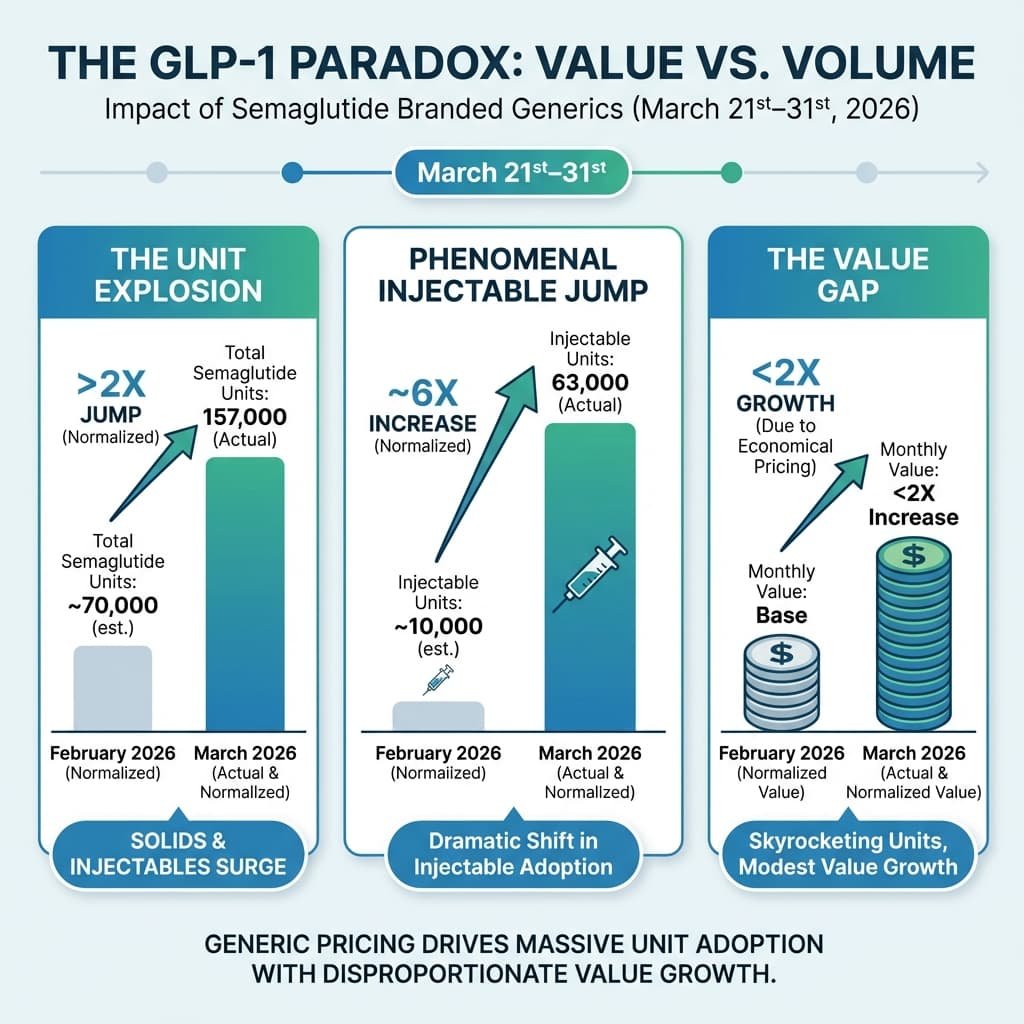 - The Unit Explosion: Total Semaglutide units (solids and injectables) surged to 157,000 in March. Normalized to 30 days, this represents a >2X jump in units.