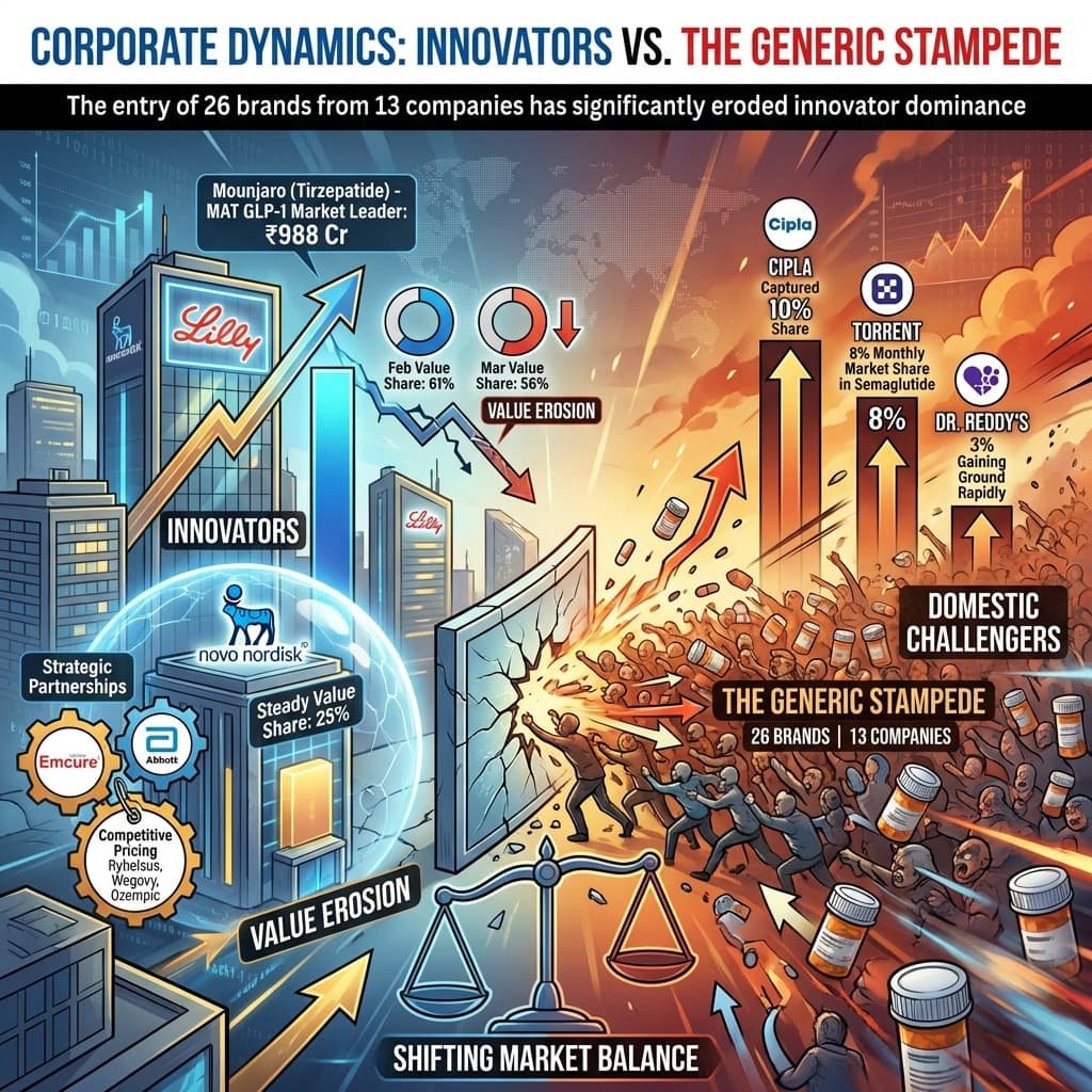 - Eli Lilly’s Value Erosion: While Tirzepatide (Mounjaro) leads the MAT GLP-1 market at ₹988 Cr, its monthly value share dropped from 61% in February to 56% in March.