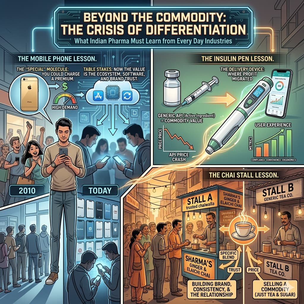 Why the $50 API crash is not a crisis of valueโbut a crisis of differentiation. And what Indian pharma must learn from mobile phones, insulin pens, and chai stalls.