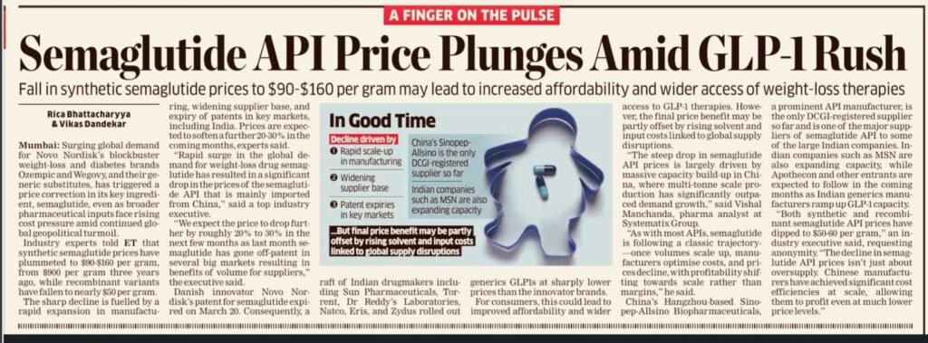 Bhattacharyya, R. & Dandekar, V. (April 2026). Semaglutide API Price Plunges Amid GLP-1 Rush. The Economic Times (Mumbai edition).